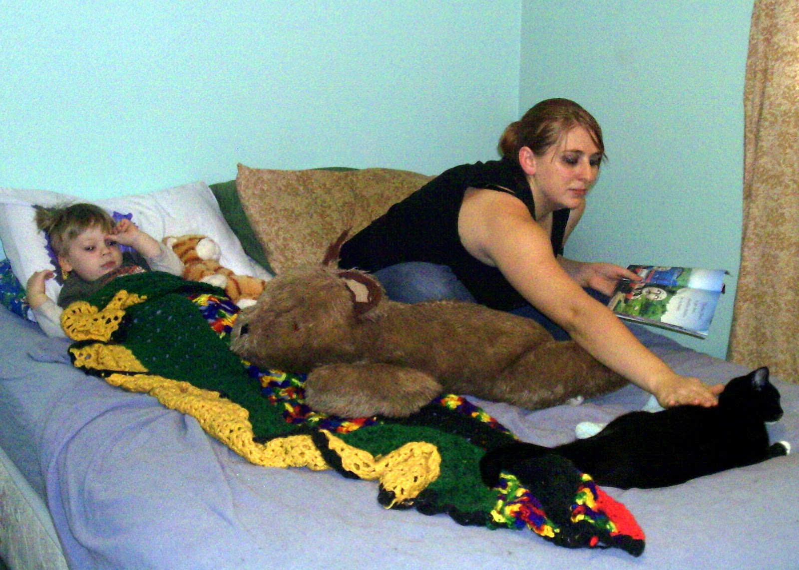 Yep, I'm Freya, and I'm a proud sock-a-holic! EVERY fuzzy sockie (and some that aren't so fuzzy) in this house is MINE! I let my brother borrow them sometimes, but they belong to ME! In the pictures above, Mommy Erin discovered that I'd brought my sockie up with me onto the bed while she was tucking JJ in for night-night time. These were from a few years ago; he's now 7 years old. Anyway, I was on my sockie, trying to hide it but wanting her to play with me with it. She got it and we had a great game of tug-of-war! As you can see, JJ thoroughly enjoyed it, too!